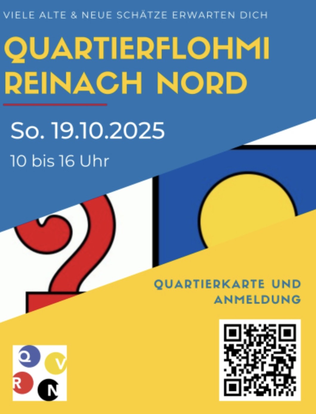Reinach NordDer Quartierflohmarkt Reinach Nord findet am Sonntag 19.10.2025 statt. Auf dem Flyer kommt ihr über den QR Code oder über die Webseite www.qvrn.ch zur Quartierkarte, auf der alle Flohmistände verzeichnet ...