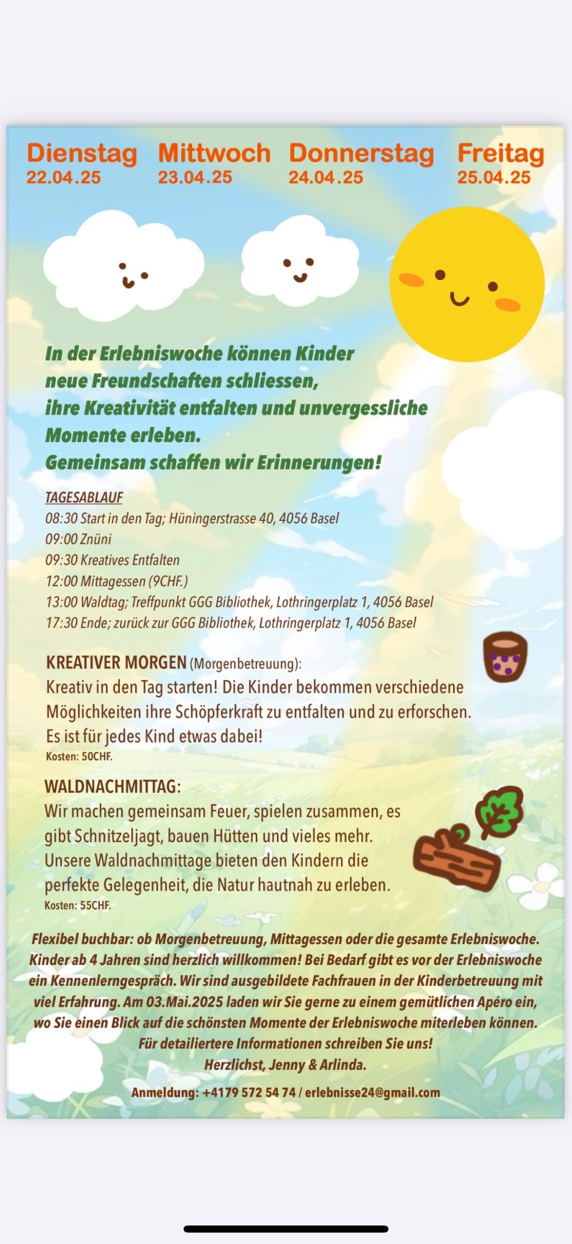 In der Erlebniswoche können Kinder neue Freundschaften schliessen, ihre Kreativität entfalten und unvergessliche Momente erleben. Gemeinsam schaffen wir Erinnerungen! Flexibel buchbar- ob nur Morgenbetreuung, Nachmittagsbetreuung oder die gesamte Erlebniswoche. (siehe ... |