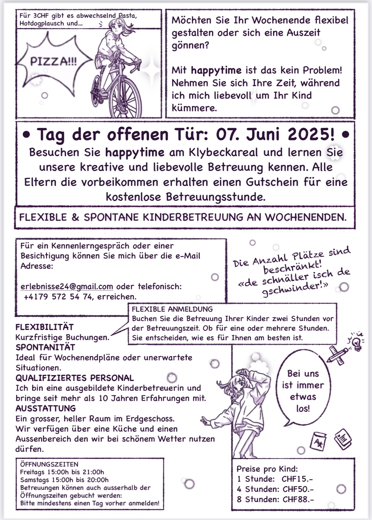 Herzlich willkommen bei Happytime! Ab dem 7. Juni 2025 biete ich in Basel (Klybeckareal 4057 in Basel) eine flexible und spontane Kinderbetreuung am Wochenende an! Ob Sie einen entspannten Tag ... |