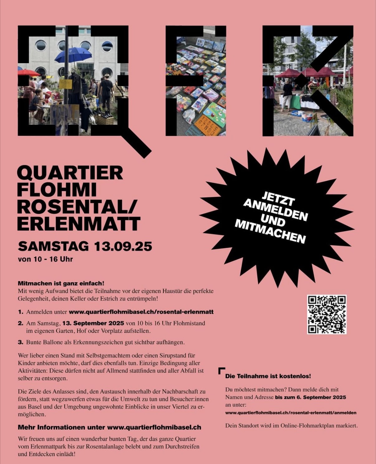 Im Quartier Rosental/Erlenmatt findet am 13. September 2025 ein Flohmarkt von Privatpersonen für Privatpersonen statt. Entdecke spannende Schätze und erlebe ungewöhnliche Einblicke in Hinterhöfe und Gärten! Die verschiedenen Standorte sind ... |